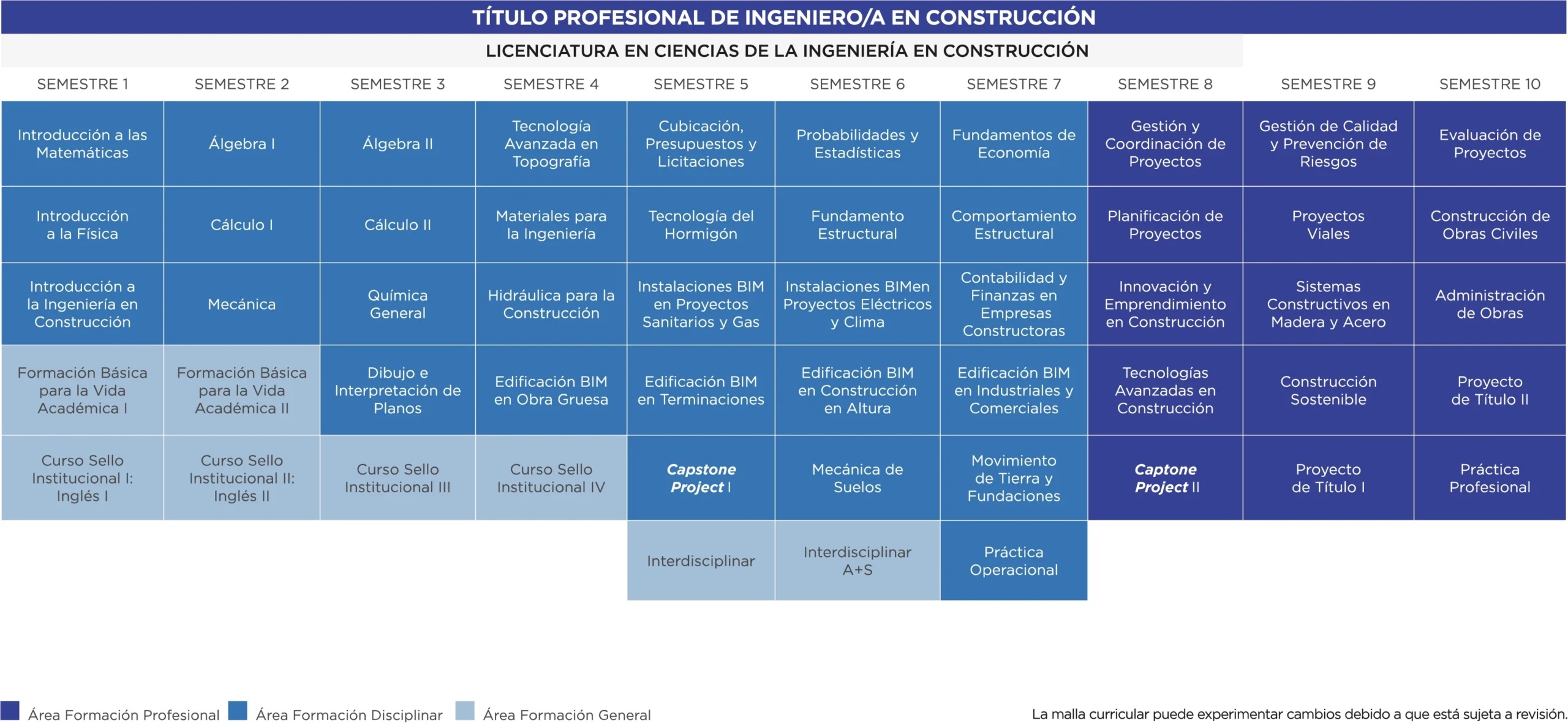 La carrera forma profesionales para la gestión técnica de cualquier obra de construcción en sus etapas de planificación y ejecución de infraestructura e inmobiliarias. El plan de estudios capacita en Ciencias Básicas de la Ingeniería y entrega las competencias digitales para enfrentar los desafíos del rubro a nivel nacional y global.